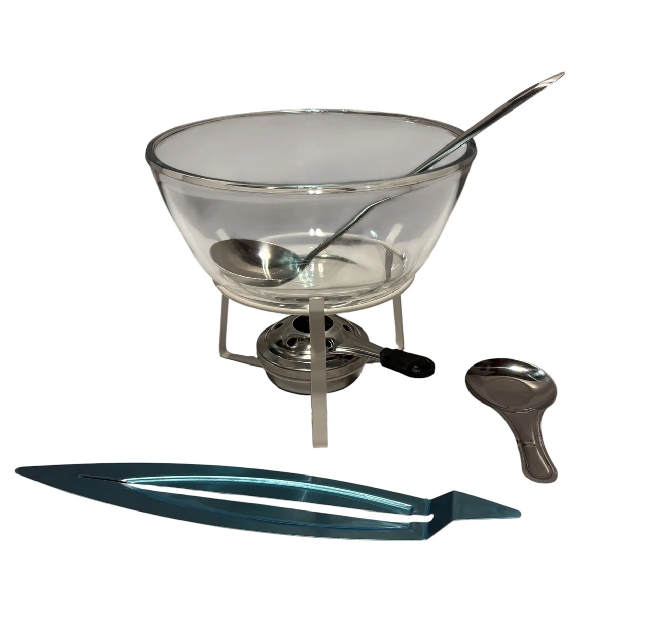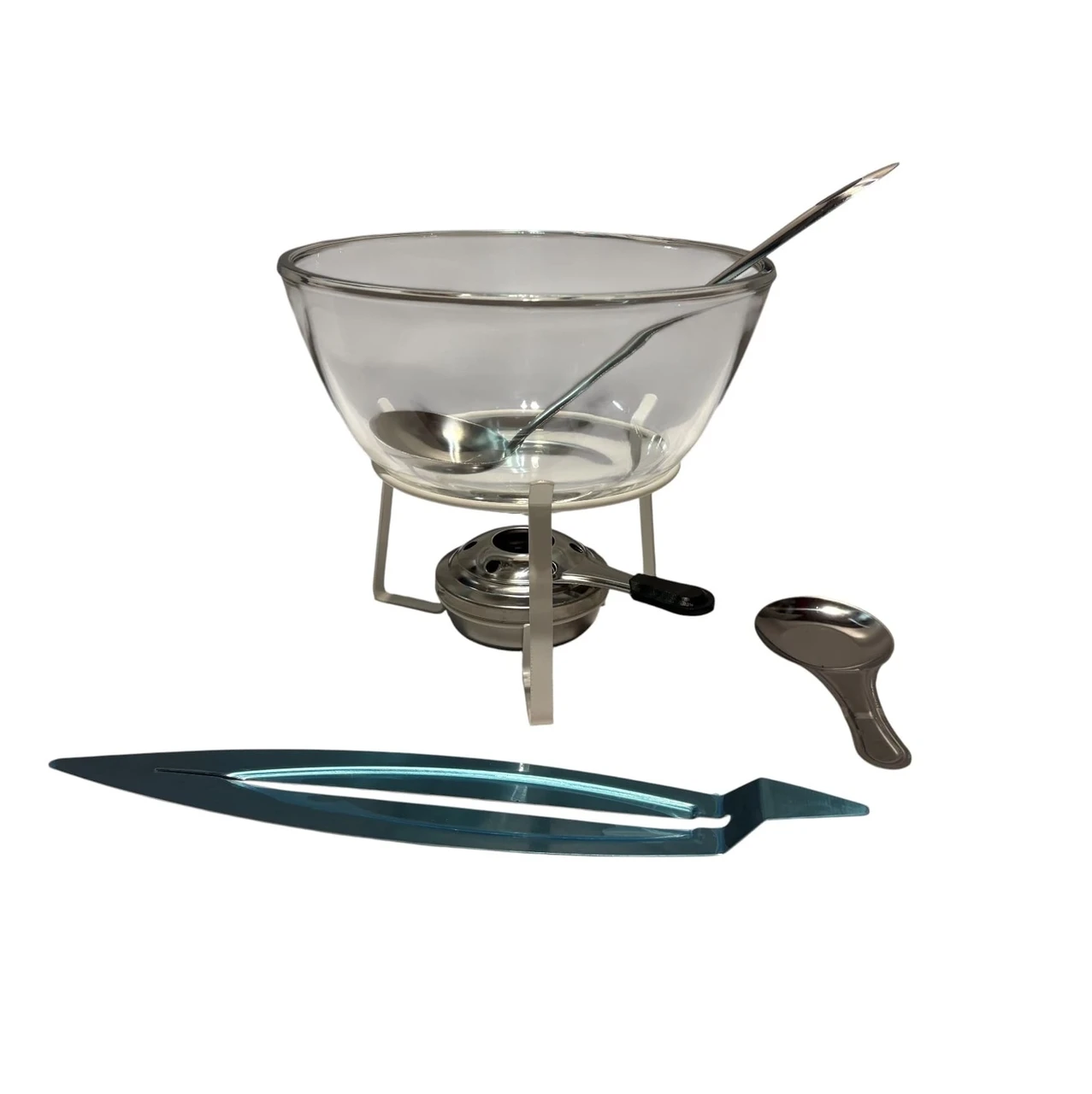 Komplektis on: klaasist kauss, valge alus klaaskausi toetamiseks, väike kulp, süütamisvahendite anum ja kustutamiseks kaas ning spetsiaalne alus lisandite (nt kaneel, apelisin) jaoks (kui ei soovi neid glögi sisse panna).