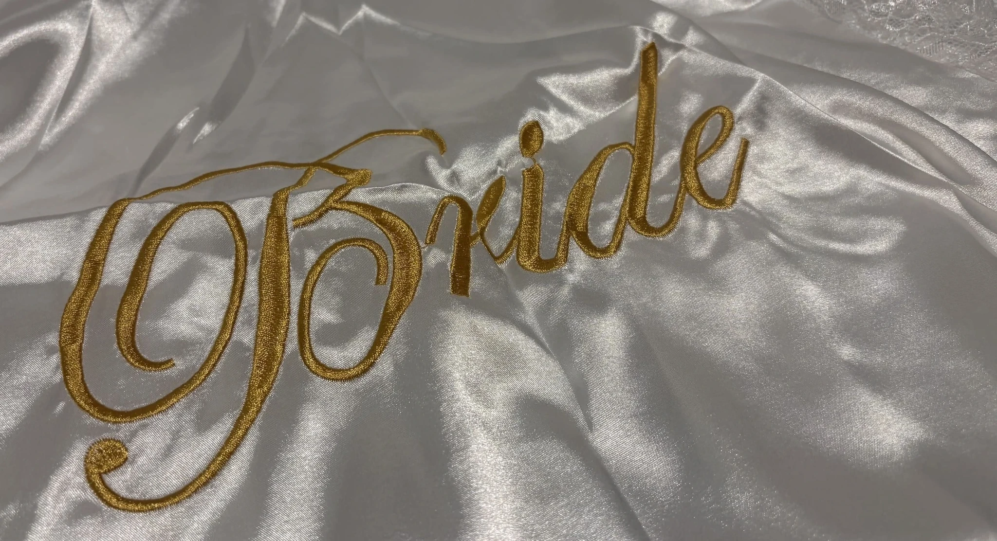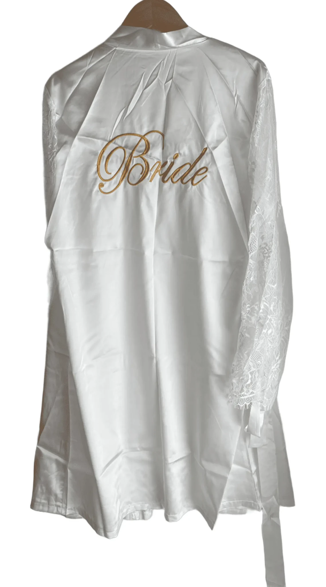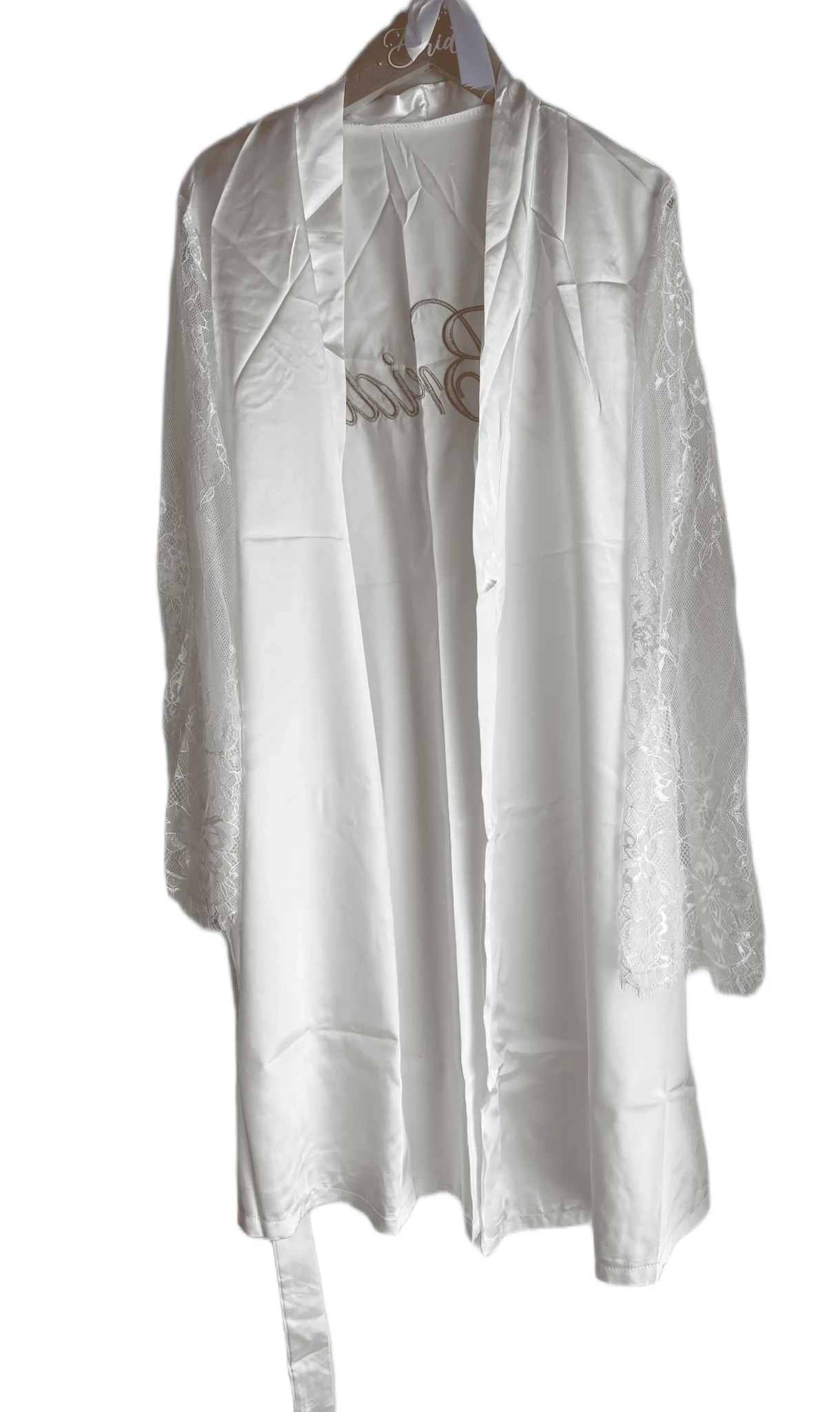 Hommikumantel, seljal kuldne kiri: "Bride".